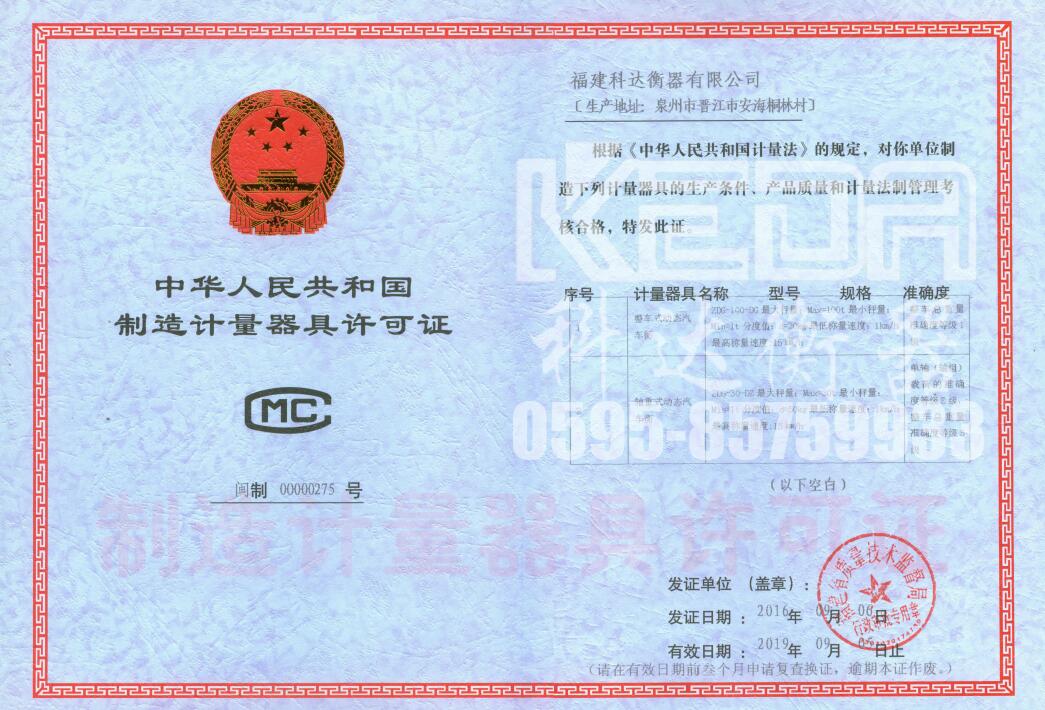 福建科達(dá)衡器獲得動(dòng)態(tài)汽車(chē)衡制造許可證