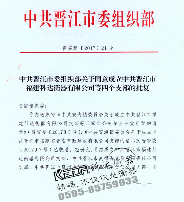 中共晉江市委組織部關(guān)于同意成立中共晉江市福建科達衡器有限公司支部的批復(fù)
