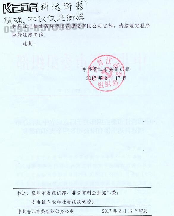 你委送來的《中共安海鎮(zhèn)委員會關(guān)于成立中共晉江市福建科達衡器有限公司支部等三家非公有制企業(yè)黨組織的請式》
